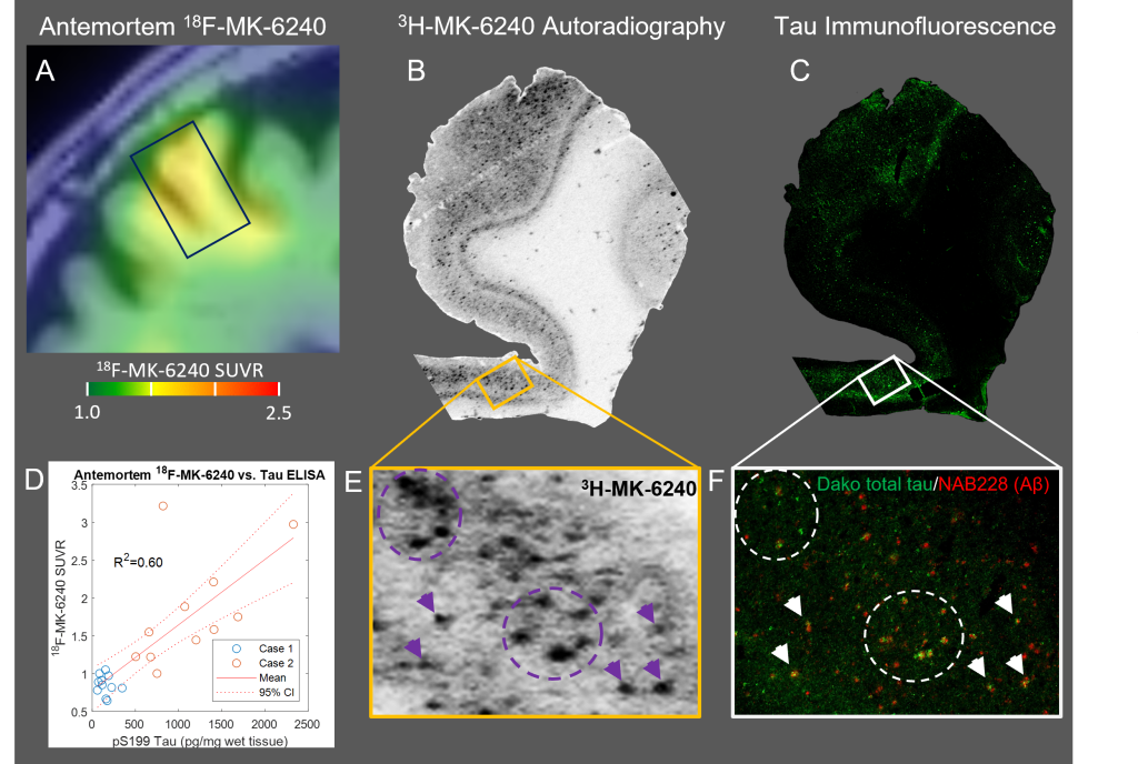 Project Summary: In collaboration with Dr. Milos Ikonomovic at the University of Pittsburgh, this study compares antemortem tau positron emission tomography (PET) imaging with [18F]MK-6240 with postmortem validation and quantification of tau, amyloid, and other brain pathologies to understand the molecular signature of [18F]MK-6240 that drives in vivo tau PET imaging.
