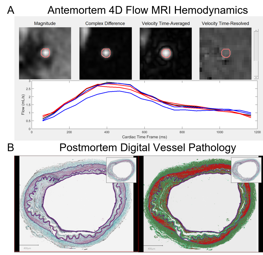 Project Summary: 4D Flow magnetic resonance imaging (MRI) is a method developed to characterize the properties of larger vessels during life. This study compares antemortem 4D Flow imaging with postmortem characterization of cerebral vessels to understand the correspondence between vessel pathology and vessel health, and antemortem 4D flow MRI outcomes.